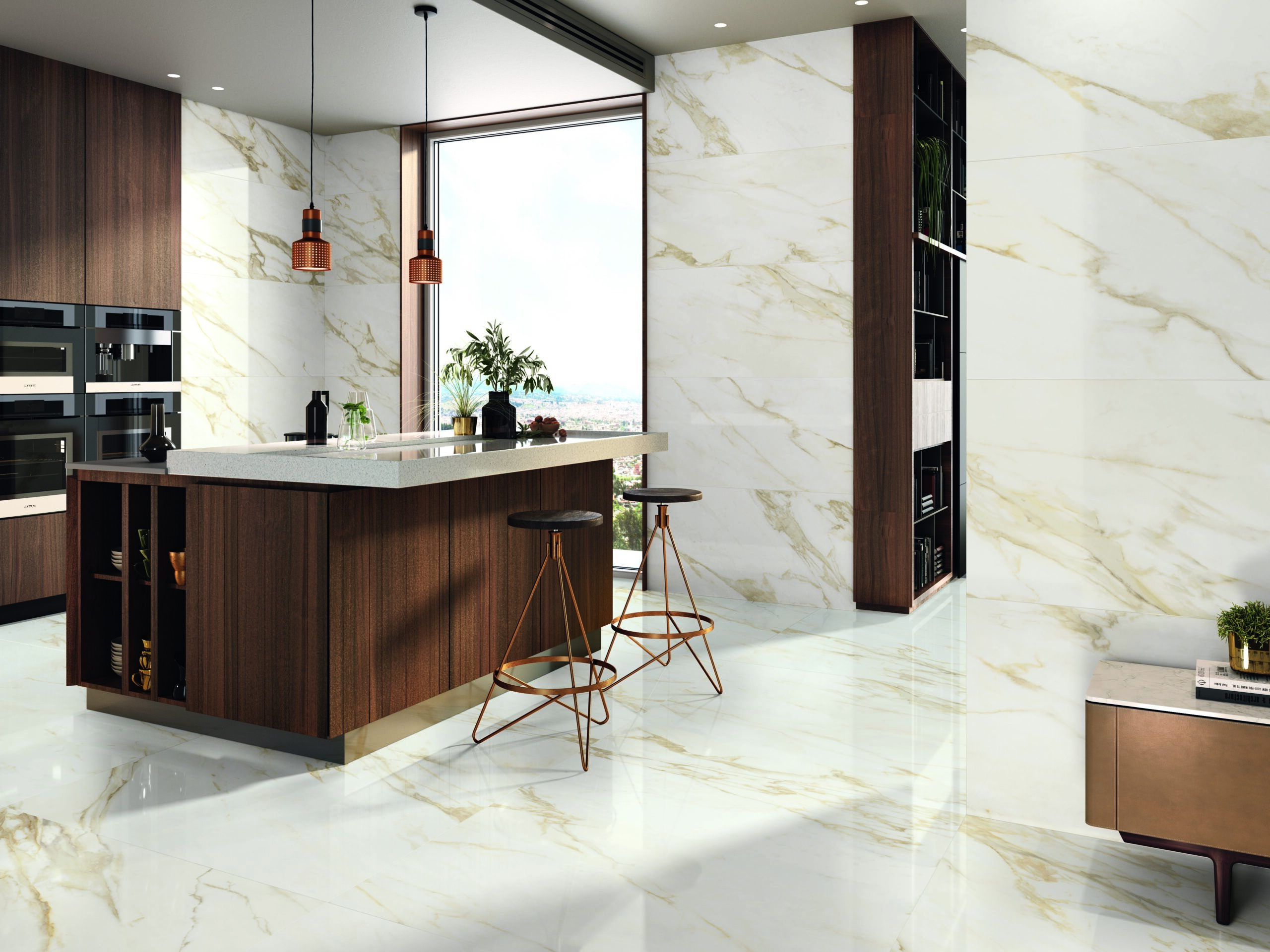 The Adaggio collection reproduces the rich texture and elegant look of Calacatta gold marble in durable polished porcelain. These tiles provide a luxurious, high-gloss surface that reflects light, elevating spaces like living rooms, bathrooms, and kitchens with a refined, classic marble look without the maintenance issues of real stone.